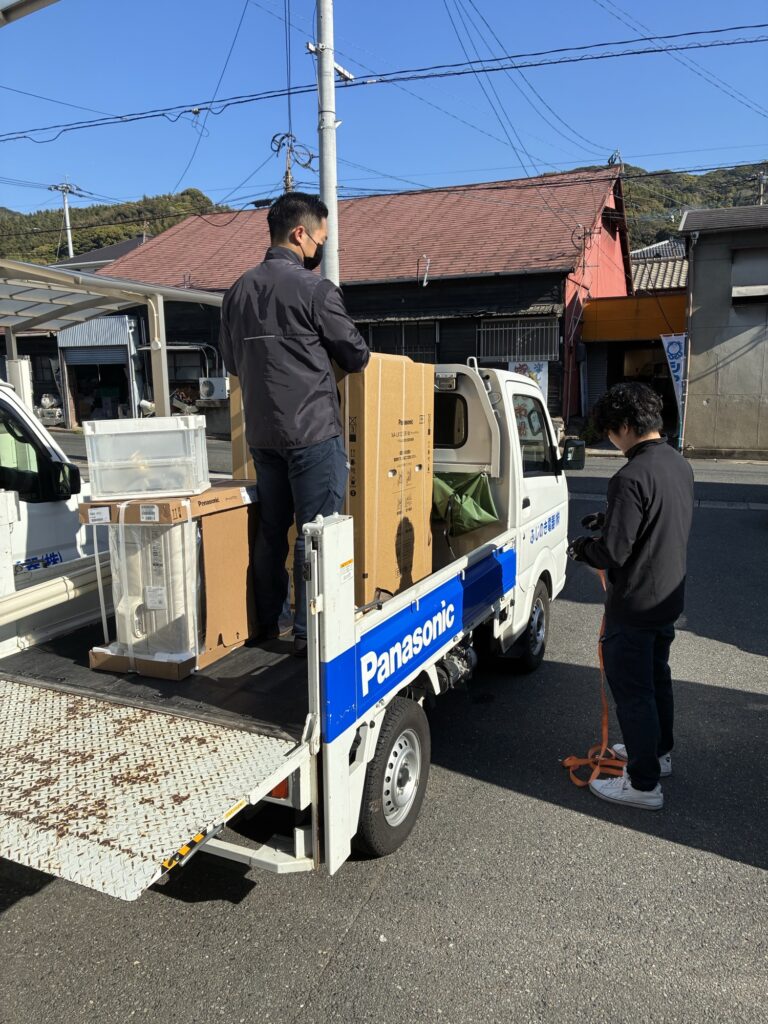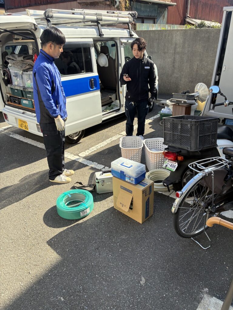 先日ドラム洗とエアコン2台の納品に伺いました。新築なので新しい生活をスタートさせるお手伝いです。太郎スタッフが西田スタッフに今日の工事の段取りの説明をしていました。