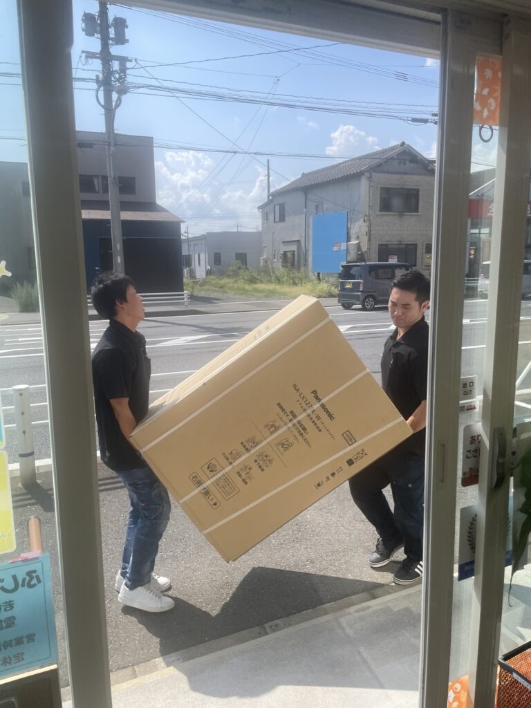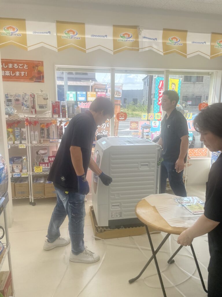 こんにちは。今日は、新製品のドラム式洗濯機が入荷しましたので、店に展示しました。