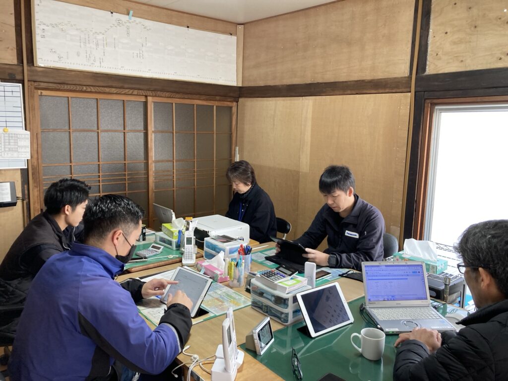 スタッフみんなで、15分ほどミーティングして、それぞれお客様の工事や納品にお伺いしました。
